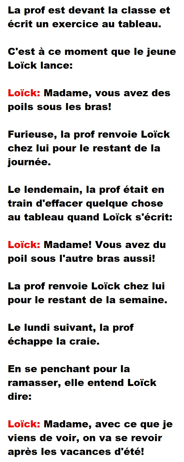 Blague de Prof, Blagues QuébécoisesUne prof est en train d’écrire un exercice au tableau quand un élève fait une remarque gênante… 👇 FAIS RIRE QUELQU'UN Facebook 106 Messenger WhatsApp Pinterest0