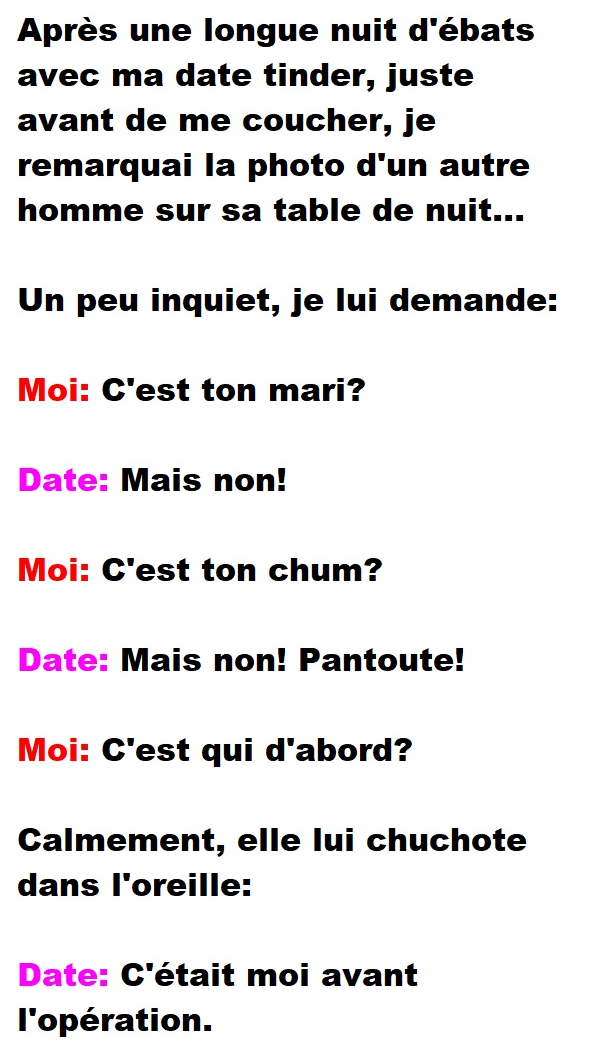 Blague de Couple, Blagues QuébécoisesJ’ai remarqué la photo d’un gars sur la table de nuit de ma date Tinder… 👇 FAIS RIRE QUELQU'UN Facebook 164 Messenger WhatsApp Pinterest0