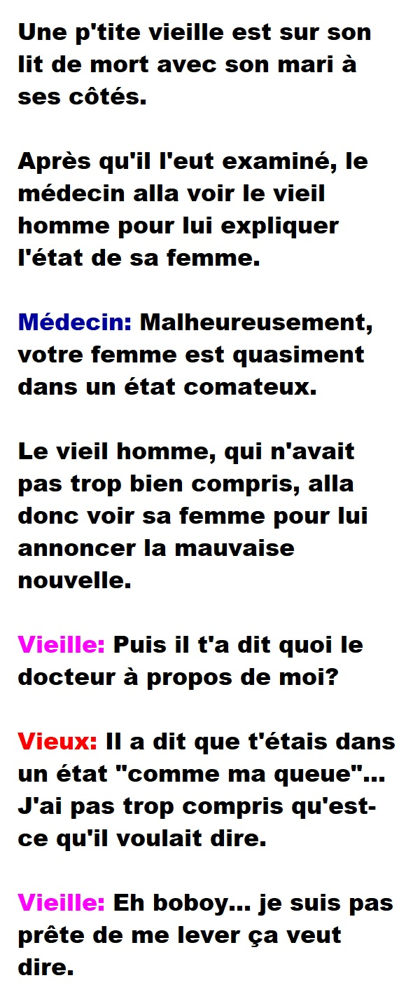 Blague de Vieille Personne, Blagues QuébécoisesUne p’tite vieille est sur son lit de mort aux côtés de son mari 👇 FAIS RIRE QUELQU'UN Facebook 66 Messenger WhatsApp Pinterest0