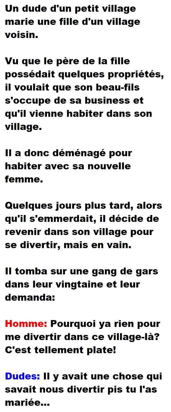 Blague de Couple, Blagues QuébécoisesUn dude d’un petit village décide de marier une fille d’un village voisin 👇 FAIS RIRE QUELQU'UN Facebook 54 Messenger WhatsApp Pinterest0