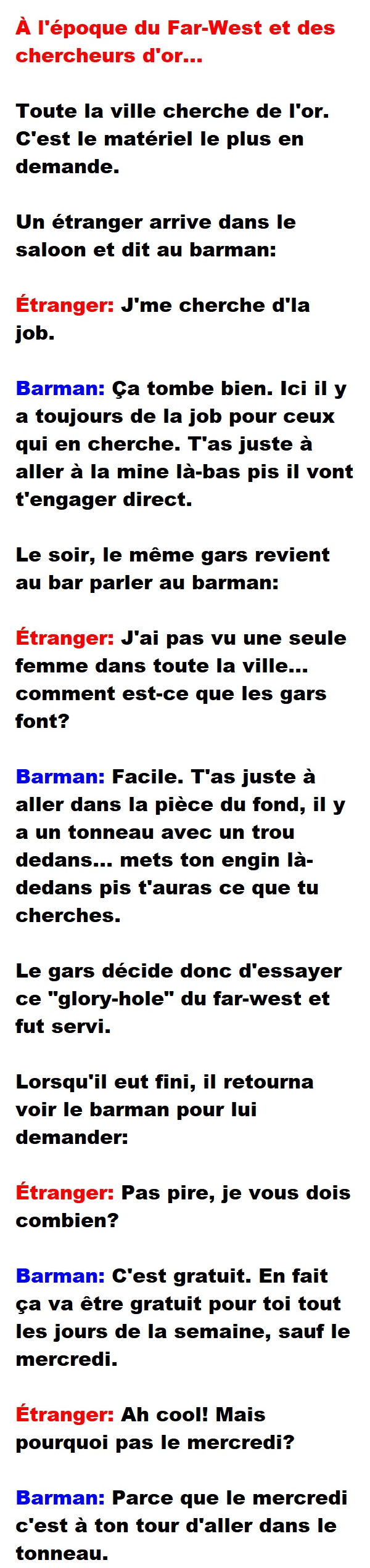 Home / Blagues Québécoises / Blague Vulgaire / Un étranger rentre dans un saloon pour se trouver une job